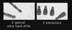 Kifejezetten a bonyolult kerékőrök kulcsnélküli leszerelésére, lefúrására kifejlesztett univerzális, professzionális szerszám készlet.