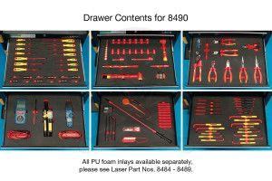 - 5. fiók: 20 db-os különféle szigetelt speciális szerszámok: Szigetelt flexibilis mágnes + tökör + karmos felszedő + lakat + biztonsági zár + patenkiszedő klt. + kábelvég klt. visszaszámláló időzítő
