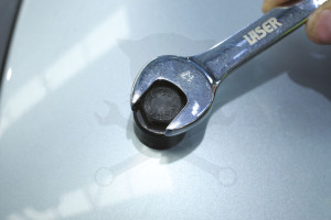 Miután az előfúró lyukat fúrták, a lyukasztót könnyedén összeszerelték, majd 17 mm-es csavarkulccsal vagy aljzattal elfordították a lökhárító műanyagának áttöréséhez.
