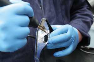 - Ezt követően a kézi markolatba helyezett "tűzőkapcsot" irányítsuk a repedt, javítandó műanyag alkatrész felé és a markolaton található kézi nyomógomb folyamatos nyomva tartása mellett a felhevült "tűzkapcsot" egyszerűen nyomjuk bele a műanyagba mindaddig, amíg a "tűzőkapocs" hullámos rögzítő felülete a műanyag felszínen el nem tűnik.