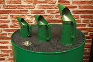 Klasszikus olajteknő doboz zöld fémszerkezetben. 3 darab kisebb és nagyobb méretekben