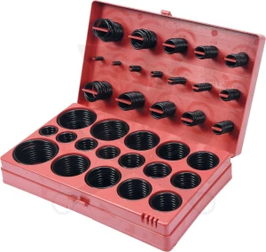 419 darabos O-gyűrű készlet NBR gumiból. A készlet 3x1,5 mm-től 50x3,5 mm-ig terjedő méreteket tartalmaz. Az egész egy praktikus "válogatós" csomagolásban található.