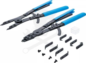 Robosztus kialakítású cserélhető fejű seeger-gyűrű fogók külső és belső gyűrűkhöz.