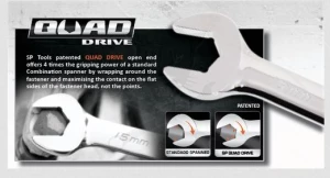 Az SP Tools szabadalmaztatott Quad Drive nyitott végű 4 lapú villáskulcsa négyszeres fogóerőt kínál a hagyományos villáskulcsokhoz képest azáltal, hogy a rögzítőelem köré tekeredik, és maximalizálja az érintkezést a rögzítőelem fejének lapos oldalain, nem pedig a hegyén.