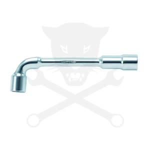 Hajlított kettős dugókulcs, a rövidebb végén lévő furat lehetővé teszi a kinyúló meneteken lévő anyák elérését is.
