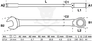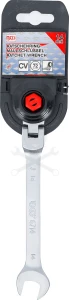 14 mm-es méretű csuklós kialakítású racsnis csillag-villáskulcs.