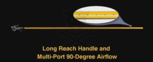Egyedi kialakítású 600 mm-es (24") csőr hosszúságú lefújó, tisztító pisztoly, speciális 90 fokos többcsatornás oldalra történő kifúvásos kivitelben.