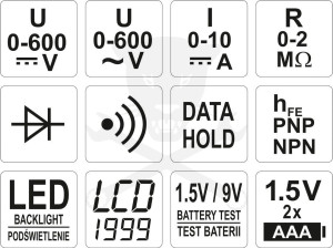 - Kijelző: LCD 3 1/2 szám - maximális kivetített érték: 1999