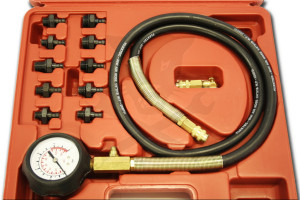 Speciális olajnyomásmérő készlet többfajta adapterrel kialakítva.