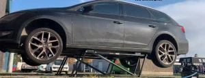 Mobil dupla alvázas emelő pneumatikus hidraulikus szivattyúval, mechanikus biztonsági zárral.
