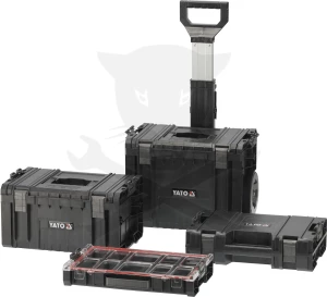 Az egész egy 4 részes, teleszkópos fogantyúval ellátott, kerekeken guruló mobil készlet, amely nagy, gumiborítású kerekekkel rendelkezik, amelyek egy fémtengelyre vannak szerelve. Ezenkívül a szállított szerszámok biztonságáról erős poliamidból készült masszív rögzítők és oldalsó csatlakozók is gondoskodnak. A fedelekbe beépített rugalmas tömítések biztosítják a fröccsenő víz elleni védelmet, ami megvédi a tartalmat a fröccsenő víztől és a portól.