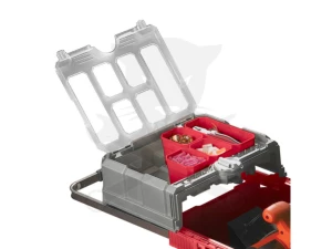- A termék egy nagy szerszámosládából kis és nagy méretű szerszámoknak, egy 6 kivehető rekeszt tartalmazó rendszerezőből és egy kézi, kivehető elválasztókat tartalmazó szerszámosládából áll.