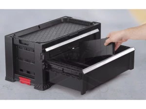 - 2 fiókos szerszámtároló. Mély fiókkal és kivehető válaszfalakkal nagyobb és nehezebb szerszámok tárolására. Praktikus, tágas fiókos tároló különböző nagyságú szerszám kényelmes, elkülönített tárolására.