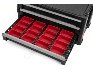 - A tárolóegység mély fiókokkal és kivehető válaszfalakkal rendelkezik, így kiválóan alkalmas a nagyobb, nehezebb szerszámok, munkaeszközök szakszerű tárolására, szállítására.