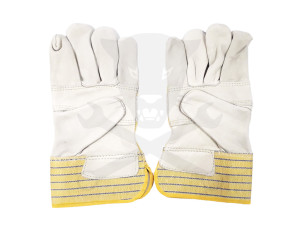 Munkáskesztyű, tehénbőrből (nappa) és sárga / kék-csíkos pamut szövetből.