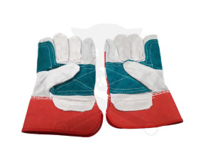 Erősített munkáskesztyű, hasított tehénbőrből és piros pamut szövetből.