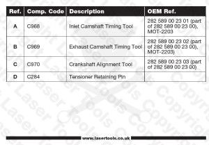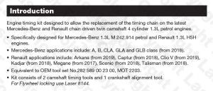 Vezérlés pozícionáló készlet, amely lehetővé teszi a vezérműlánc cseréjét a legújabb Mercedes-Benz és Renault lánchajtású ikervezérműtengelyes, 4 hengeres 1,3 literes benzinmotorokon.