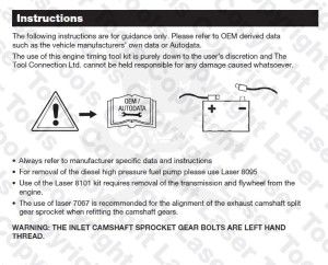 A vezérműtengely fogaskerekeinek visszaszerelésekor a Laser Tools gyártmányú a LAS-7067 cikkszámú osztott fogaskerék beállító célszerszám használatát javasolja a kipufogó vezérműtengely osztott fogaskerék lánckerék beállításához.